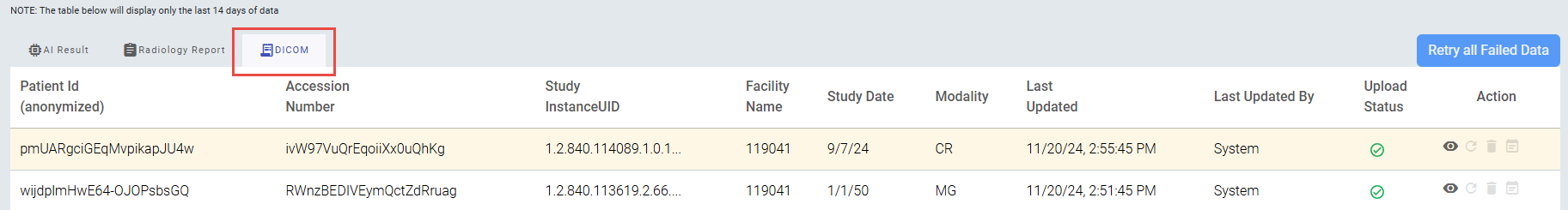 - DICOM Tab: Clicking on DICOM tab will display list of Facility Name, Patient ID (anonymized), Accession Number (anonymized), Study UID, Study Description, Study Date, Modality, Last Updated (time stamp), Last Updated by, Upload Status (Failed, Not Started, In Progress, Processed).
