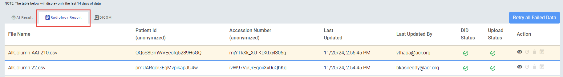 - Radiology Report Tab: Clicking on Radiology Report tab will display list of File Name, Patient ID (anonymized), Accession Number (anonymized), Last Updated (time stamp), Last Updated by, DID status (Processed/Failed), Upload Status (Failed, Not Started, In Progress, Processed).