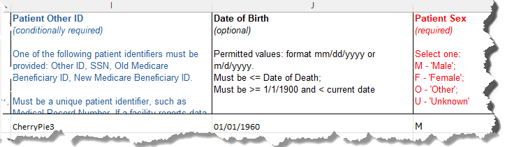 Blue – conditionally required. For example, Patient Other ID is required if no other patient identifier is reported. Otherwise, it is optional.